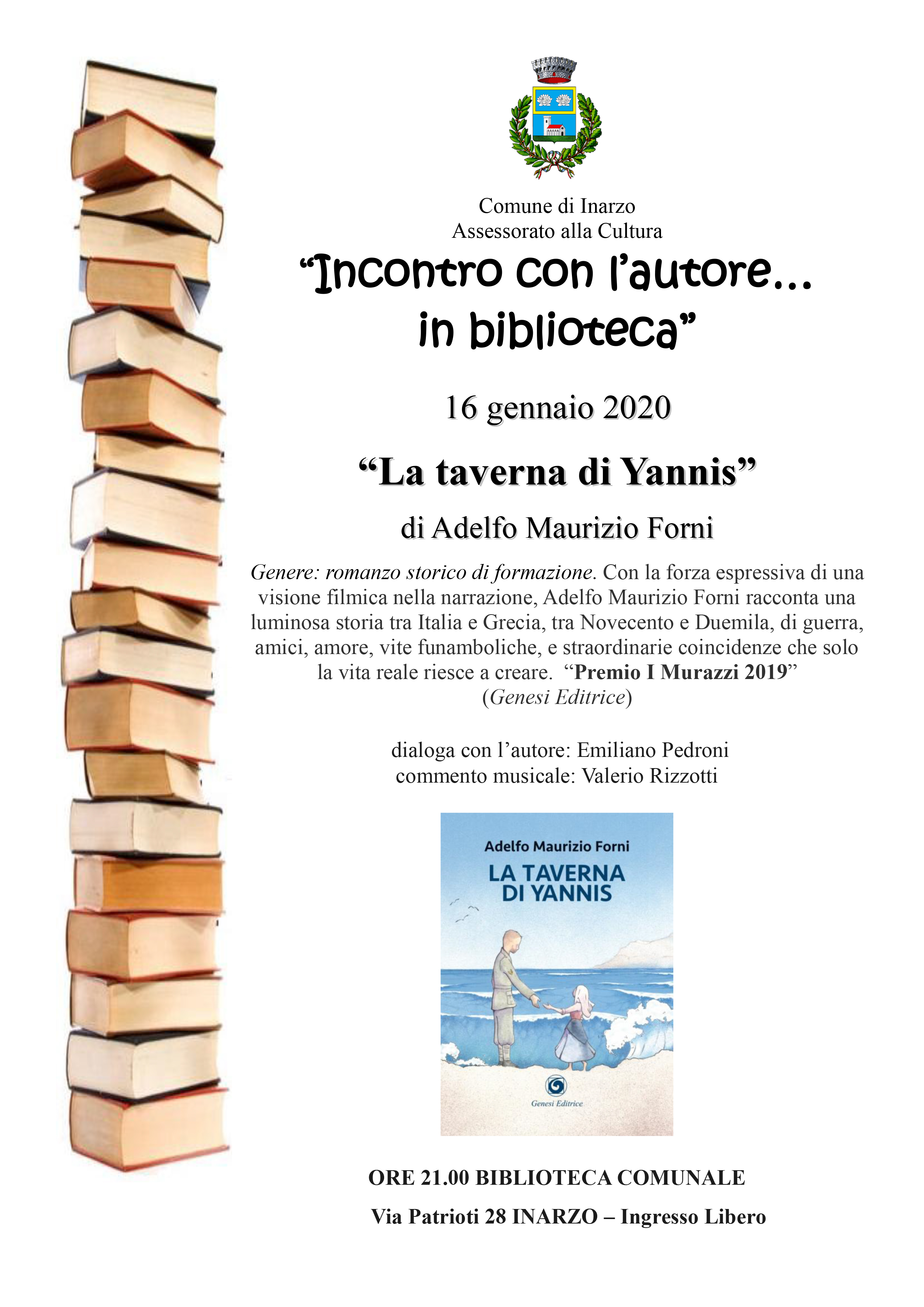 "INCONTRI CON L'AUTORE...IN BIBLIOTECA" GIOVEDI' 16 GENNAIO 2020 "LA TAVERNA DI YANNIS" DI ADELFO MAURIZIO FORNI - DIALOGA CON L'AUTORE: EMILIANO PEDRONI COMMENTO MUSICALE: VALERIO RIZZOTTI.