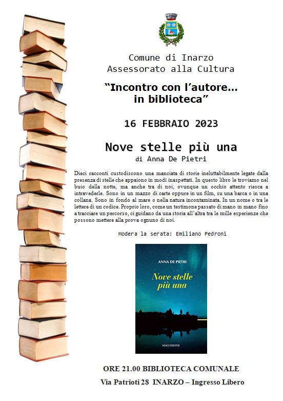 "INCONTRI CON L'AUTORE...IN BIBLIOTECA" GIOVEDI' 16 FEBBRAIO 2023 NOVE STELLE PIU' UNA DI ANNA DE PIETRI - MODERA LA SERATA: EMILIANO PEDRONI