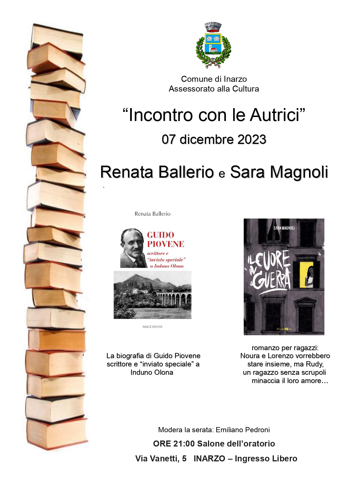 "INCONTRO CON LE AUTRICI" GIOVEDI' 7 DICEMBRE 2023 "GUIDO PIOVENE SCRITTORE E "INVIATO SPECIALE" A INDUNO OLONA" DI RENATA BALLERIO E "IL CUORE IN GUERRA" DI SILVIA MAGNOLI - MODERA LA SERATA: EMILIANO PEDRONI
