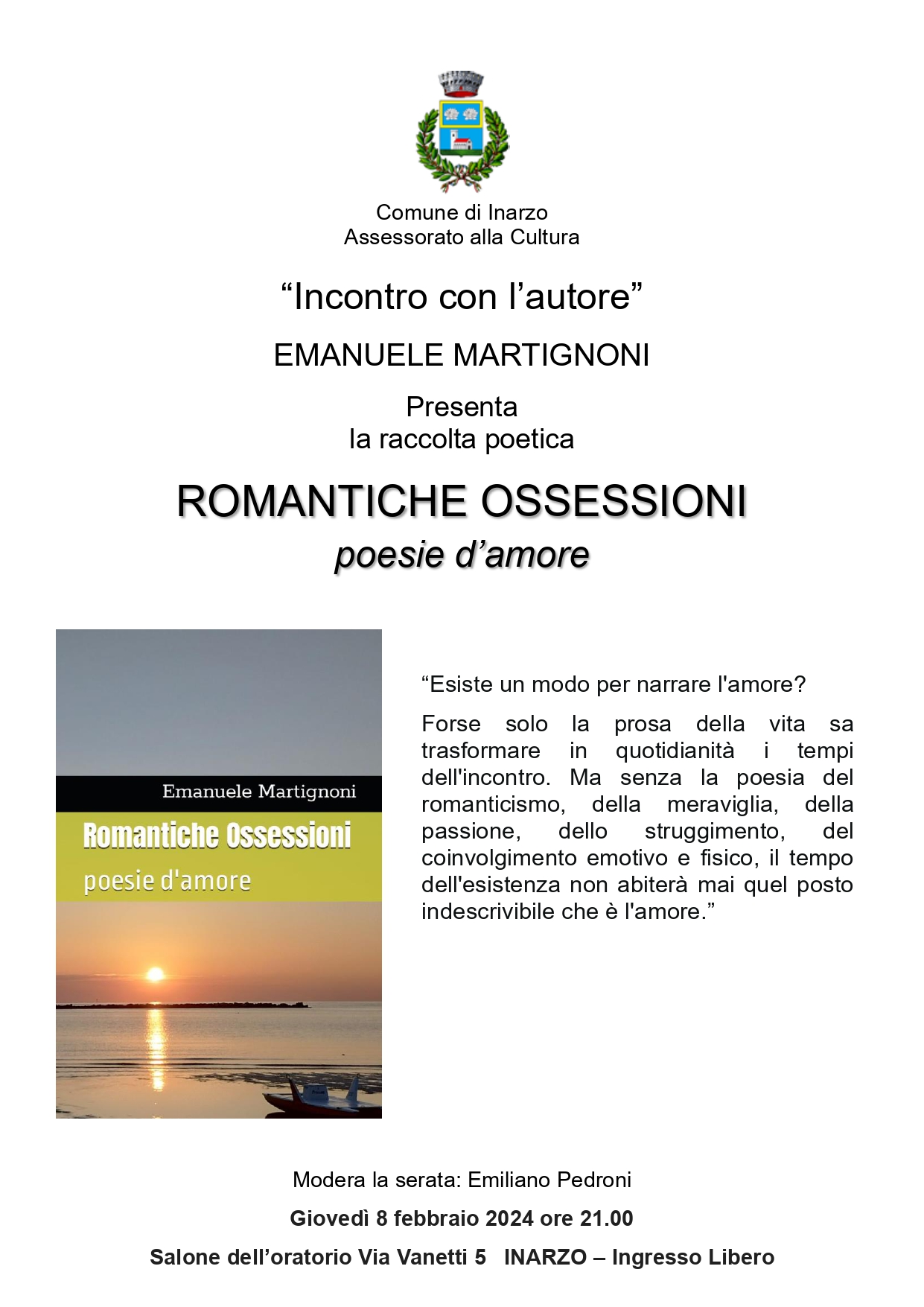 "INCONTRO CON L'AUTORE" GIOVEDI' 8 FEBBRAIO 2024 "ROMANTICHE OSSESSIONI POESIE D'AMORE" - DI EMANUELE MARTIGNONI - MODERA LA SERATA: EMILIANO PEDRONI
