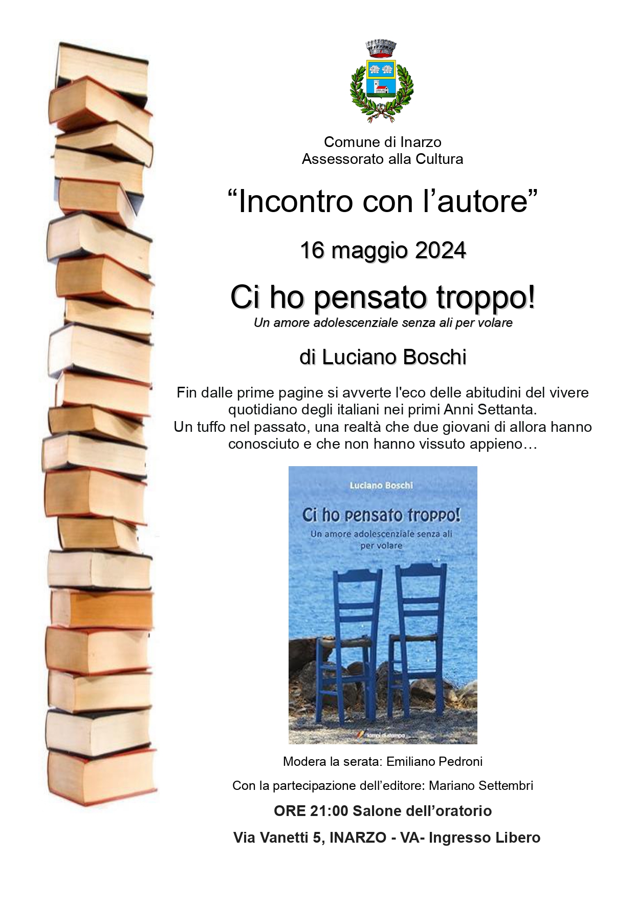 "INCONTRO CON L'AUTORE" GIOVEDI' 16 MAGGIO 2024 CI HO PENSATO TROPPO! UN AMORE ADOLESCENZIALE SENZA ALI PER VOLARE - DI LUCIANO BOSCHI - MODERA LA SERATA: EMILIANO PEDRONI