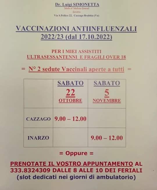 in allegato gli avvisi del Dott. Surace e del Dott. Simonetta, relativi alle sedute per le vaccinazioni antinfluenzali.