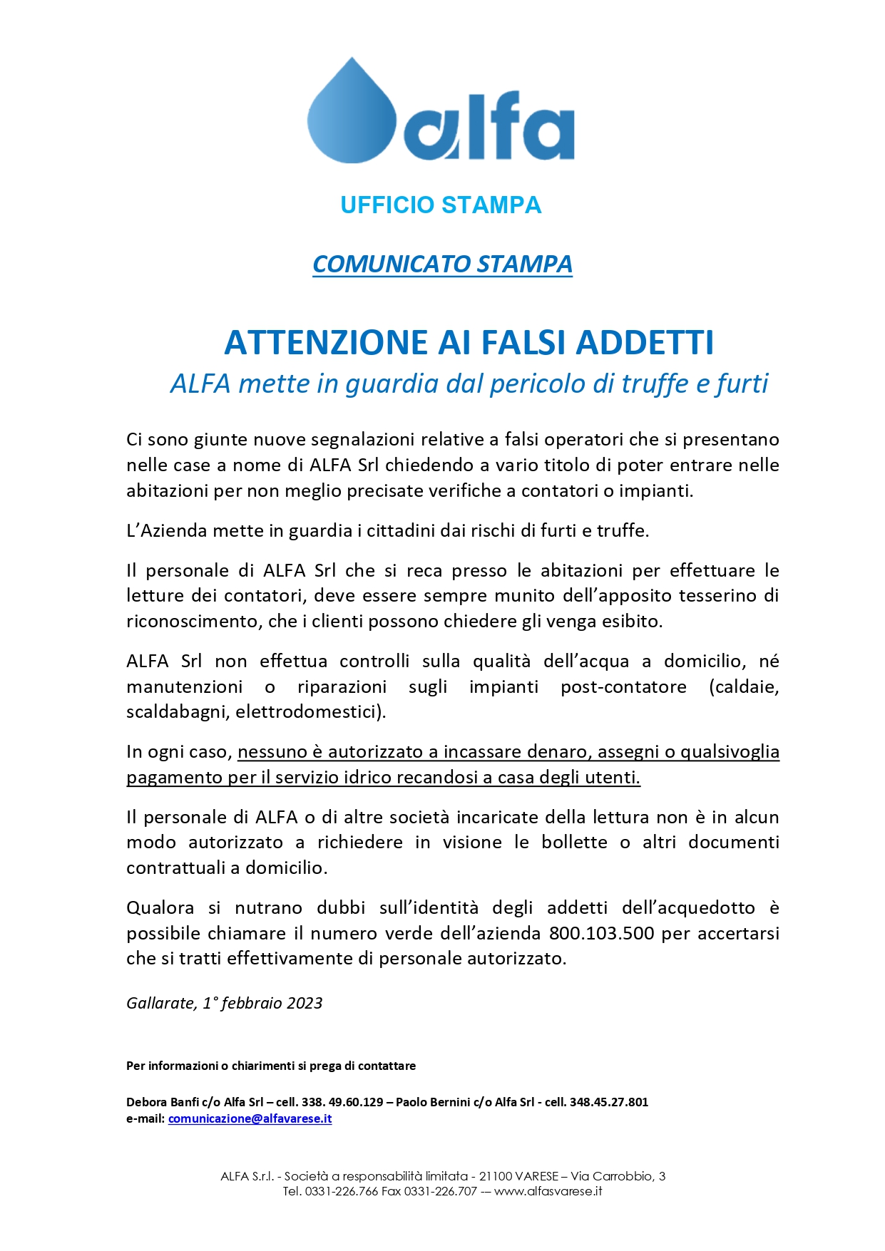Pubblicato: 04 Febbraio 2023 Condividi Facebook Twitter Google Plus Whatsapp Telegram Email ALFA SRL - COMUNICATO IN MERITO AI FALSI ADDETTI