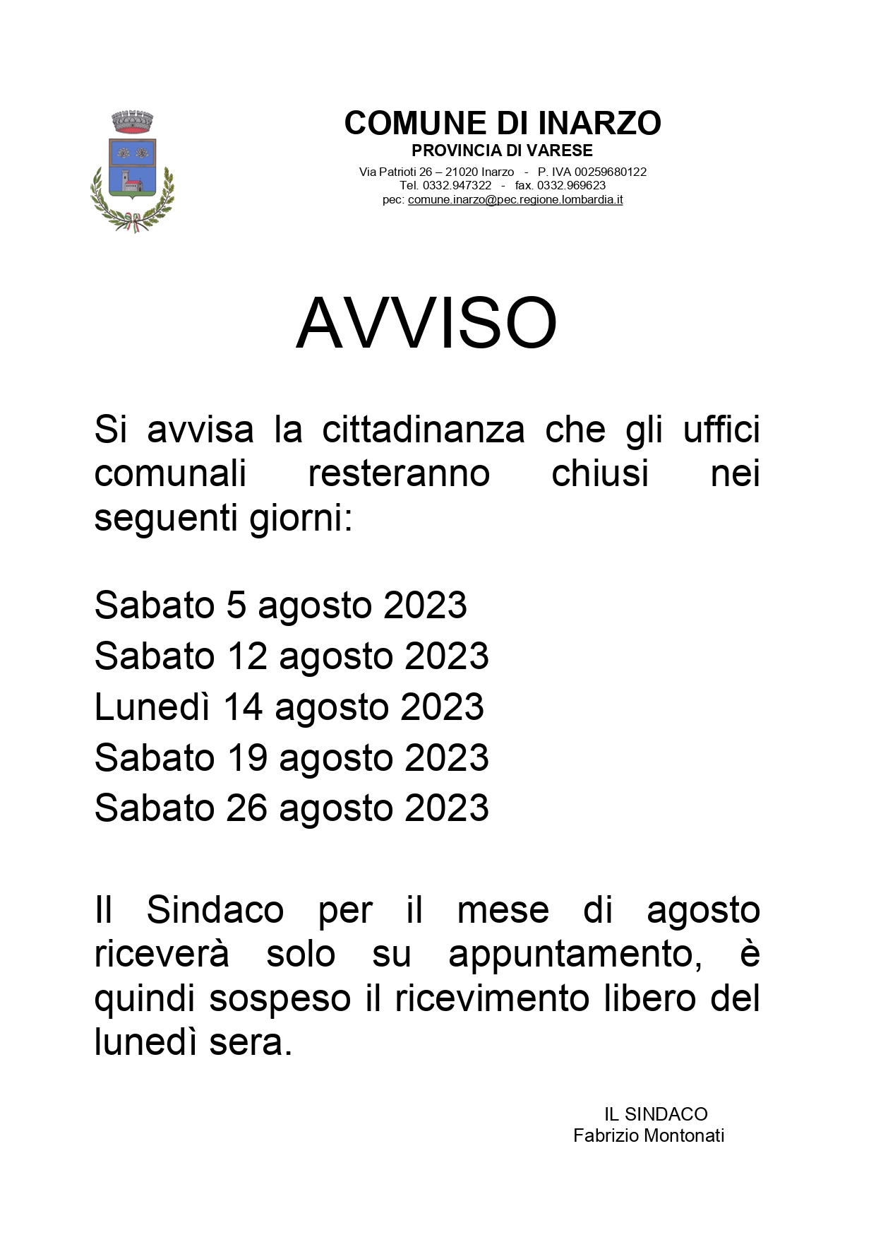 Pubblicato: 27 Luglio 2023 Condividi Facebook Twitter Google Plus Whatsapp Telegram Email CHIUSURA UFFICI COMUNALI - MESE DI AGOSTO