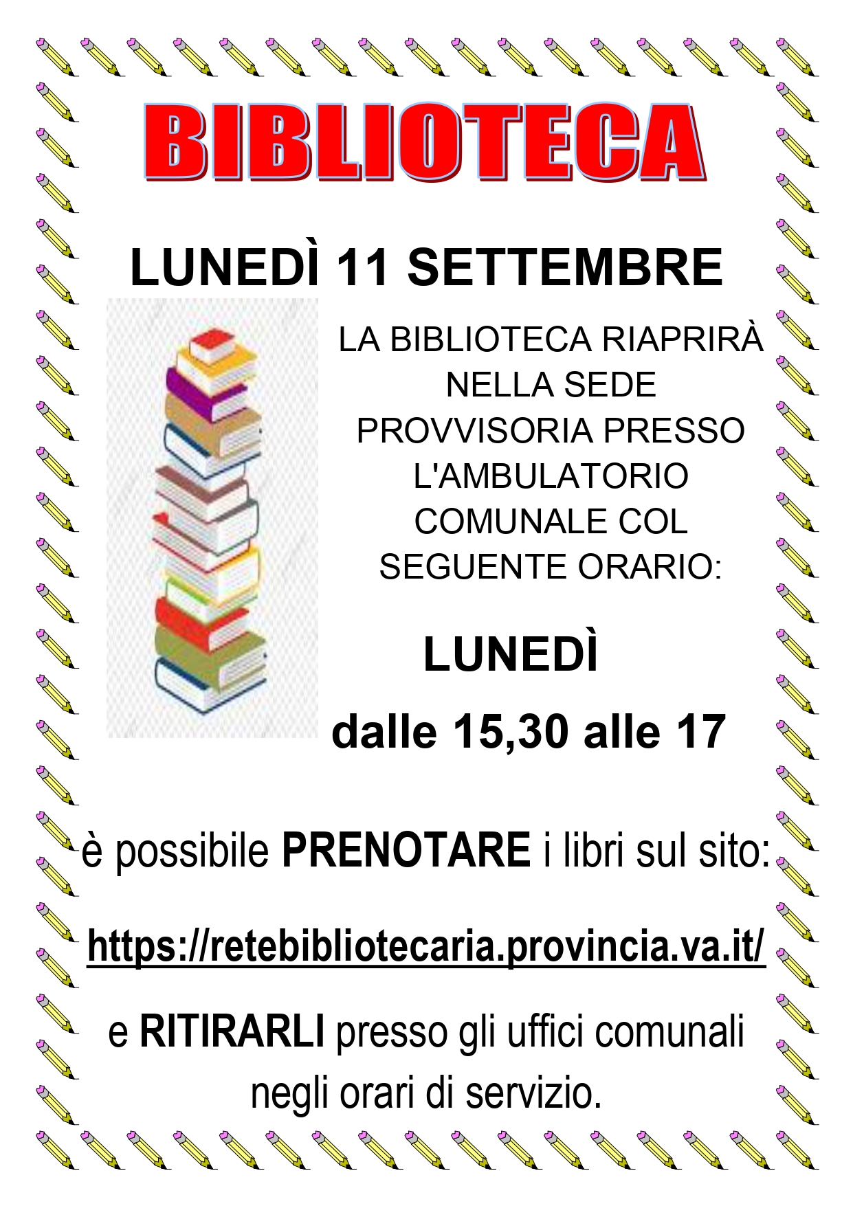 Pubblicato: 17 Agosto 2023 Condividi Facebook Twitter Google Plus Whatsapp Telegram Email RIAPERTURA BIBLIOTECA