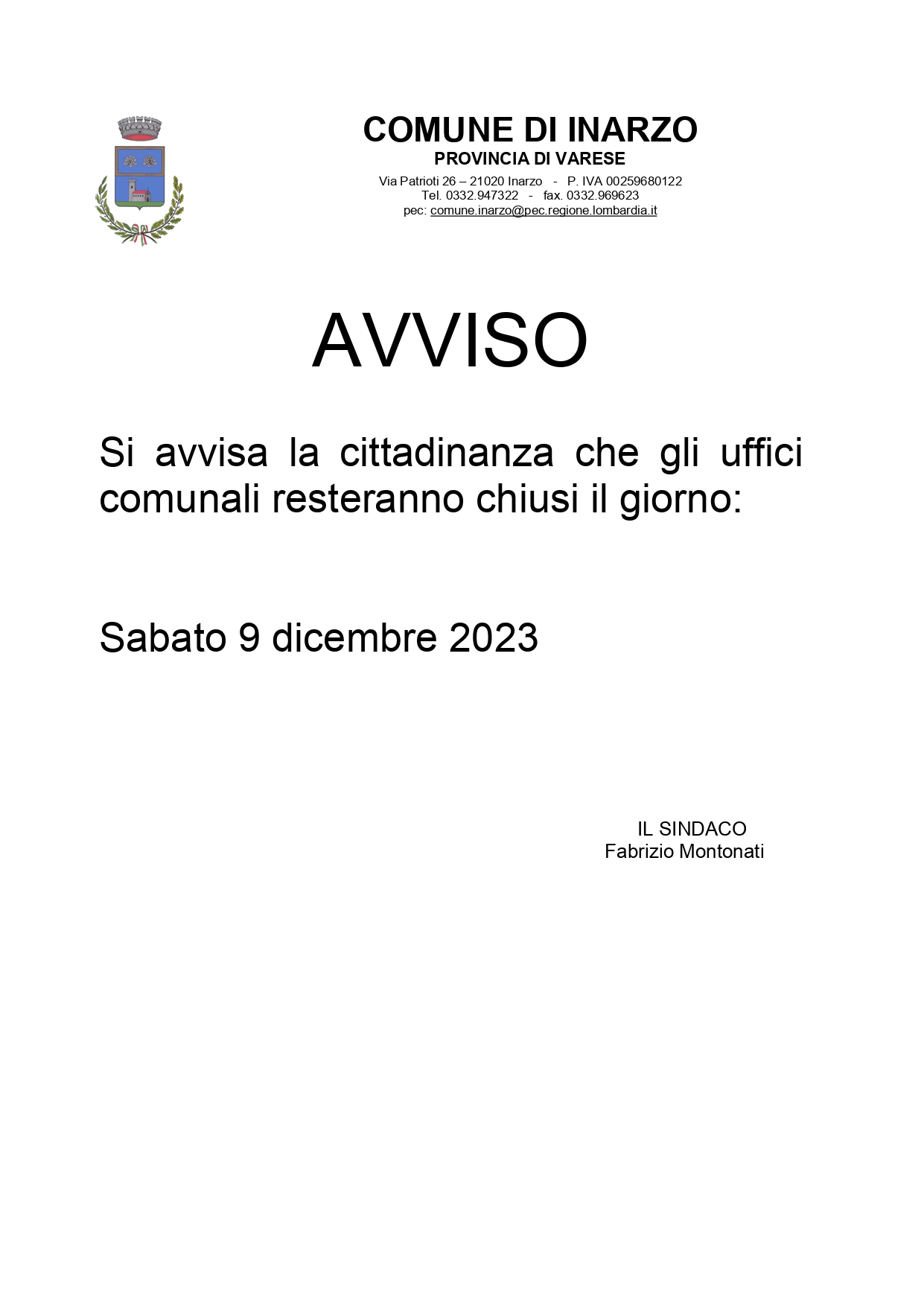 Pubblicato: 05 Dicembre 2023 Condividi Facebook Twitter Google Plus Whatsapp Telegram Email AVVISO CHIUSURA UFFICI COMUNALI