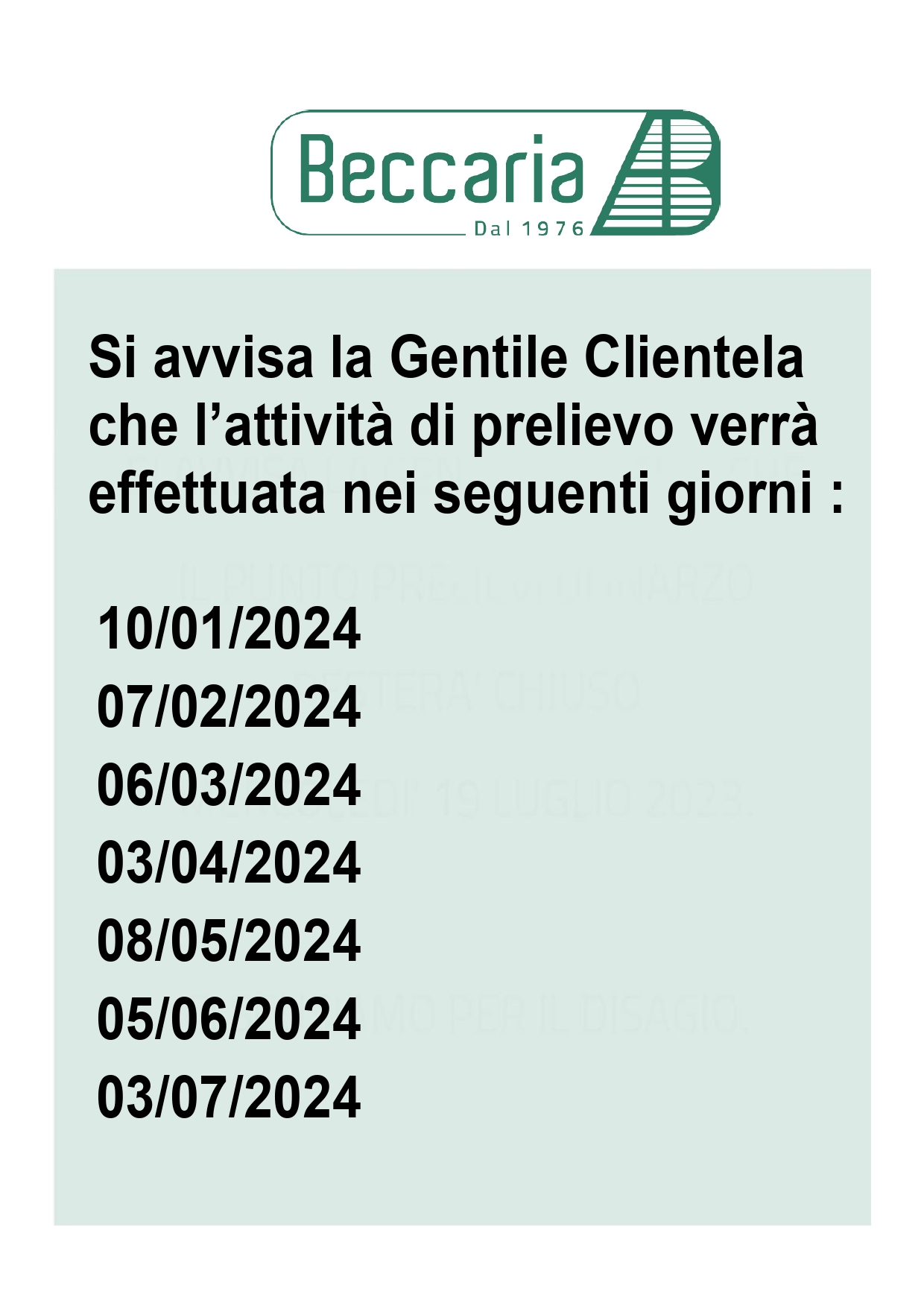 Pubblicato: 22 Dicembre 2023 Condividi Facebook Twitter Google Plus Whatsapp Telegram Email CENTRO PRELIEVI BECCARIA - COMUNICAZIONE DATE PRELIEVI Di seguito le date in cui verranno effettuati i prelievi c/o l'ambulatorio comunale, nei consueti orari: 7:00 - 9:30