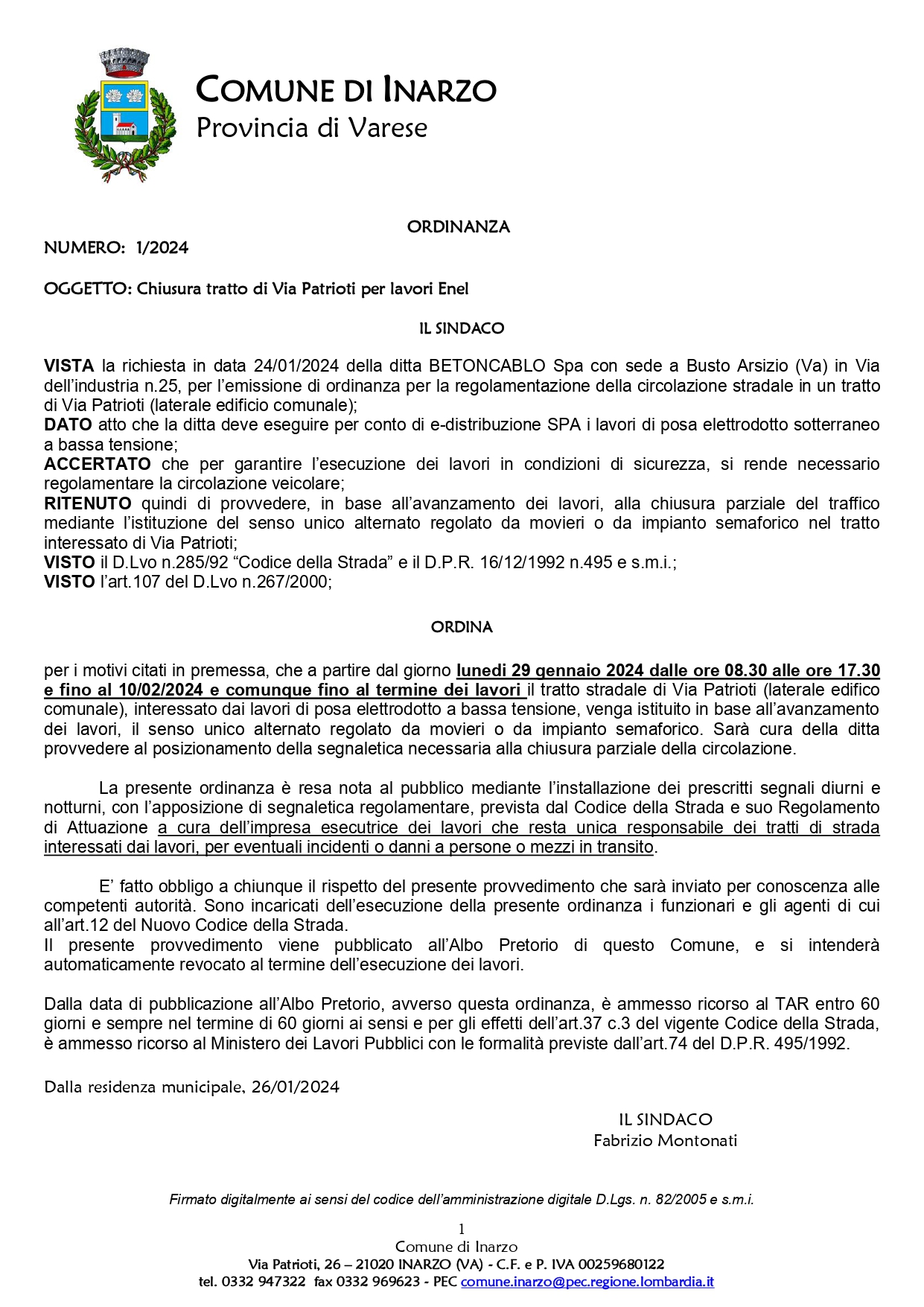 Pubblicato: 26 Gennaio 2024 Condividi Facebook Twitter Google Plus Whatsapp Telegram Email ORDINANZA N.1/2024 - CHIUSURA TRATTO DI VIA PATRIOTI