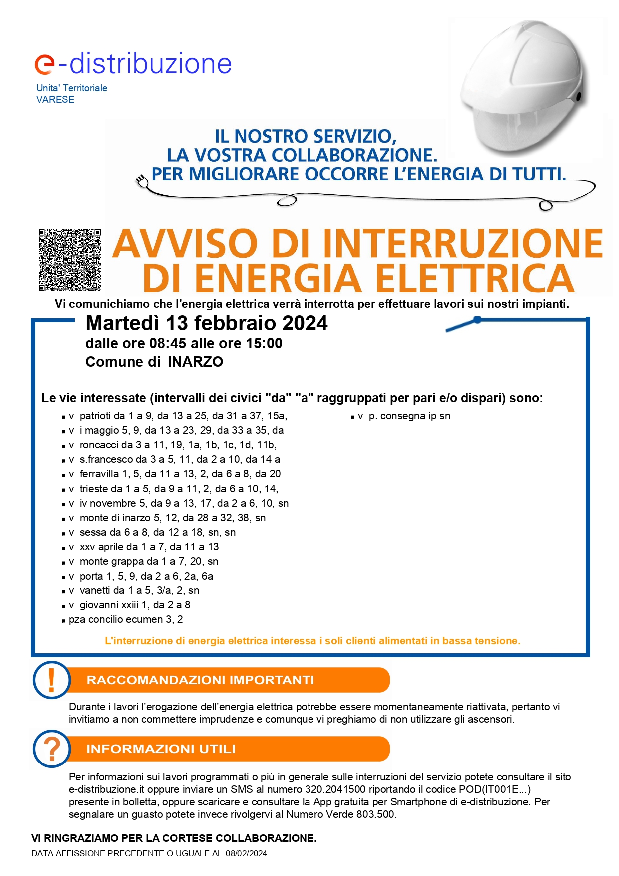 Pubblicato: 09 Febbraio 2024 Condividi Facebook Twitter Google Plus Whatsapp Telegram Email AVVISO DI INTERRUZIONE DEL SERVIZIO DI EROGAZIONE DELL'ENERGIA ELETTRICA PER IL GIORNO 13/02/24 H. 8:45 - 15:00 Si pubblica quanto ricevuto da E-distribuzione. Attachments: FileDimensione FileData Caricamento VOLANTINO.pdf522 kB09-02-2024 09:18