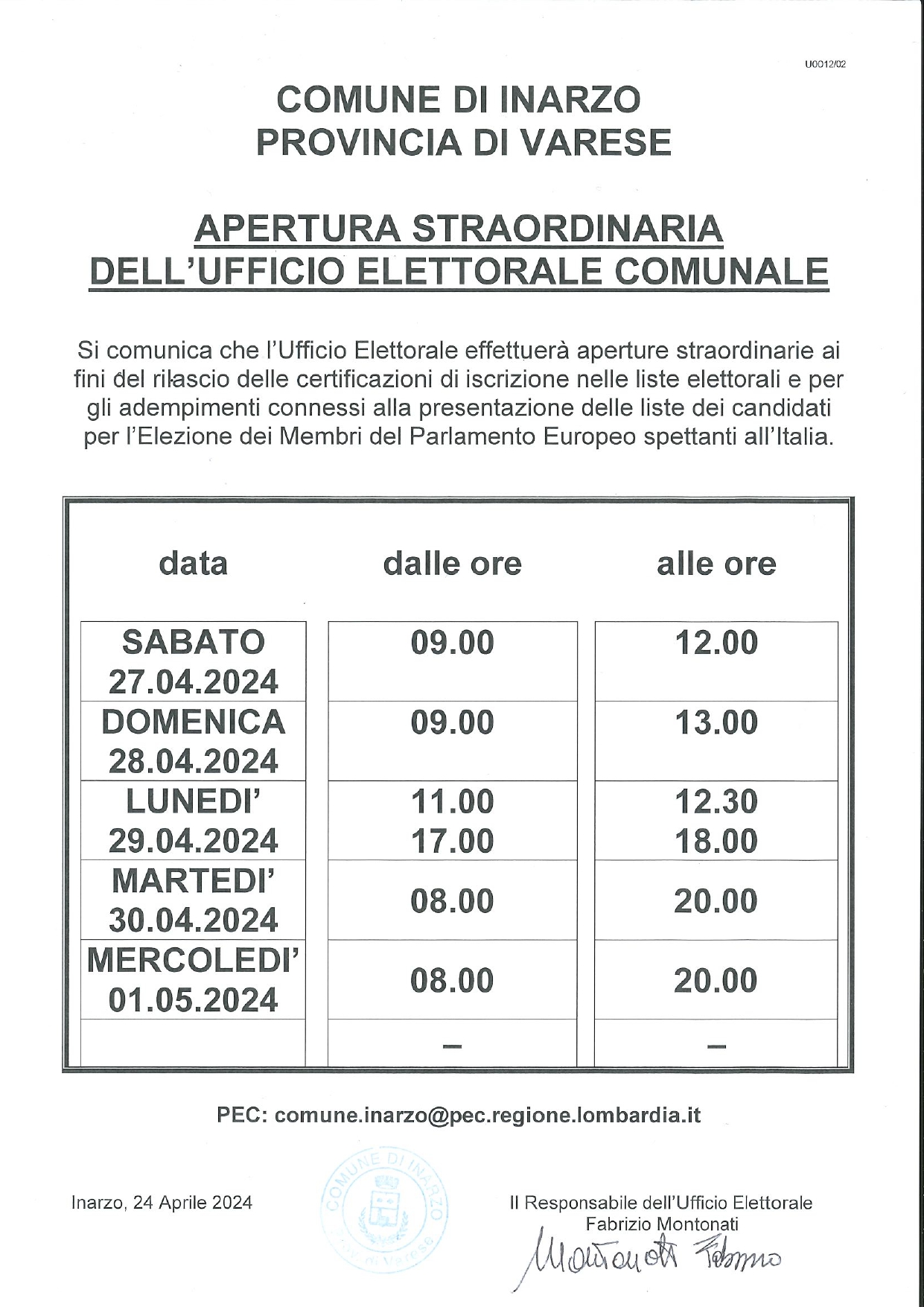 Pubblicato: 24 Aprile 2024 Condividi Facebook Twitter Google Plus Whatsapp Telegram Email APERTURA STRAORDINARIA DELL'UFFICIO ELETTORALE COMUNALE