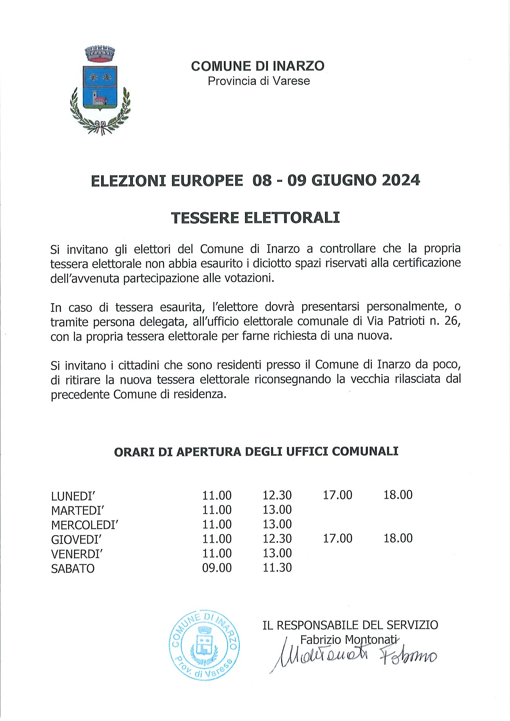 Pubblicato: 09 Maggio 2024 Condividi Facebook Twitter Google Plus Whatsapp Telegram Email TESSERE ELETTORALI - ELEZIONI EUROPEE 08 - 09 GIUGNO 2024
