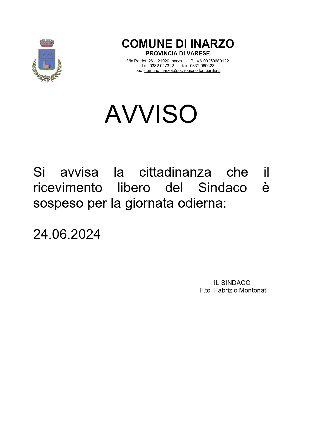 Pubblicato: 24 Giugno 2024 Condividi Facebook Twitter Google Plus Whatsapp Telegram Email AVVISO SOSPENSIONE RICEVIMENTO SINDACO - 24 GIUGNO 2024
