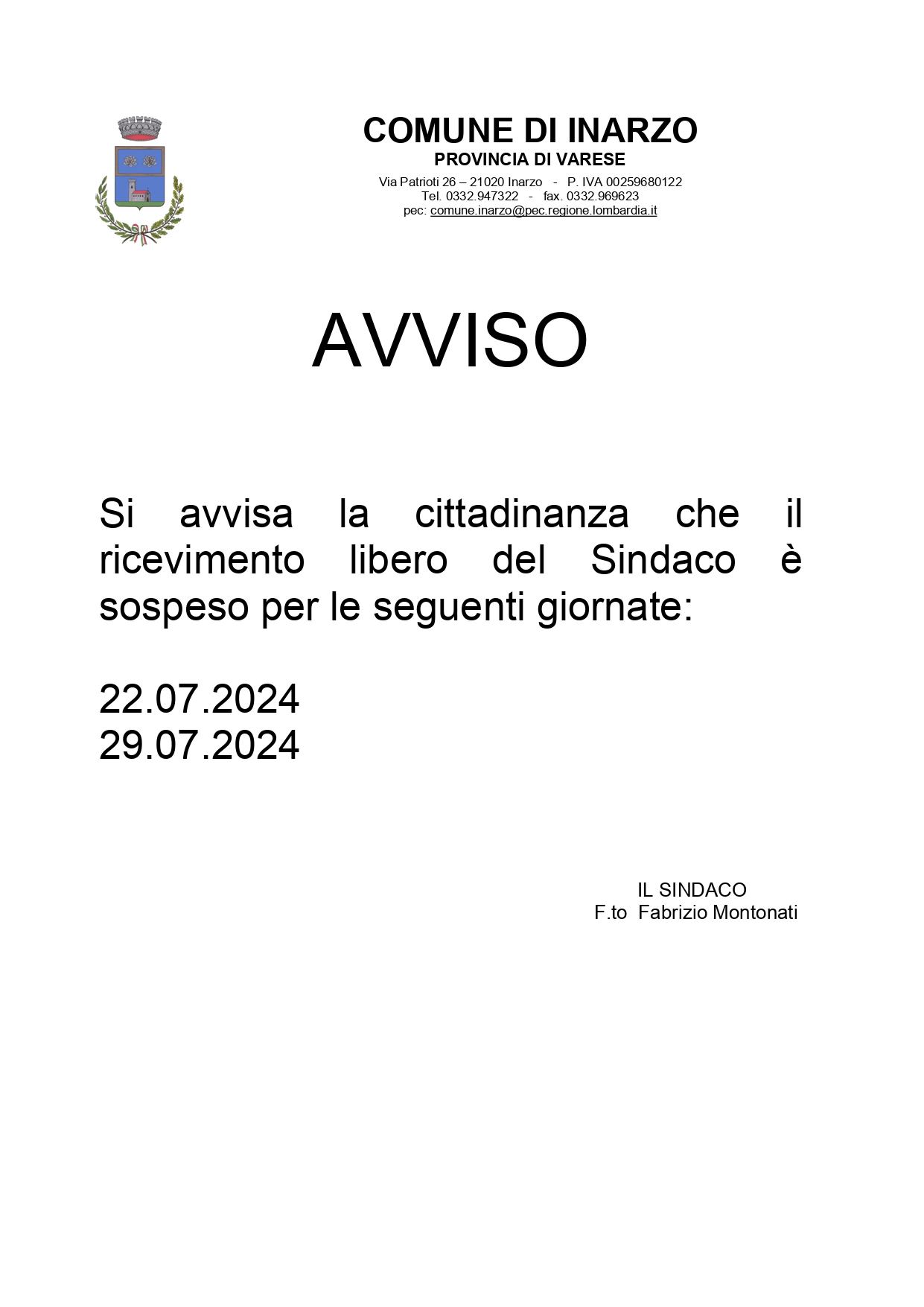 Pubblicato: 22 Luglio 2024 Condividi Facebook Twitter Google Plus Whatsapp Telegram Email AVVISO SOSPENSIONE RICEVIMENTO SINDACO - 22 E 29 LUGLIO 2024